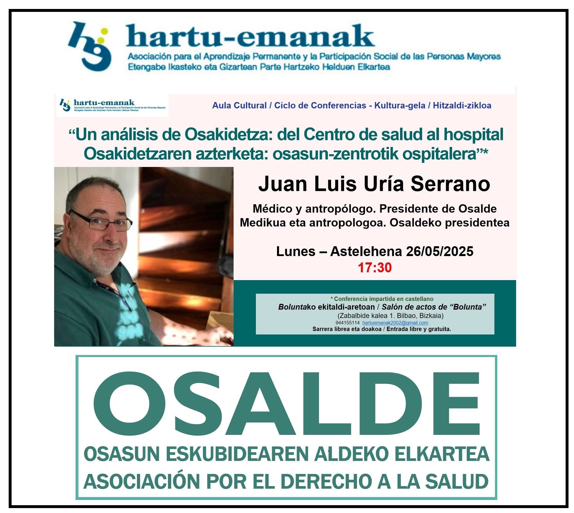 Charla-debate por el Presidente de Osalde, organizado por Hartu hemanak. «Un análisis de Osakidetza: del Centro de salud al hospital Osakidetzaren azterketa: osasun-zentrotik ospitalera”
