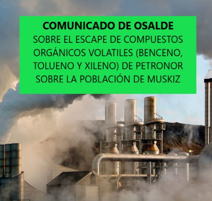 COMUNICADO DE OSALDE SOBRE EL ESCAPE DE COMPUESTOS ORGÁNICOS VOLATILES (BENCENO, TOLUENO Y XILENO) DE PETRONOR SOBRE LA POBLACIÓN DE MUSKIZ