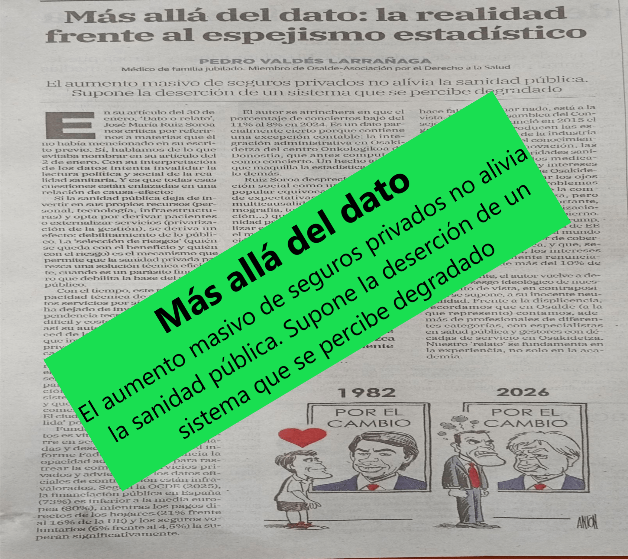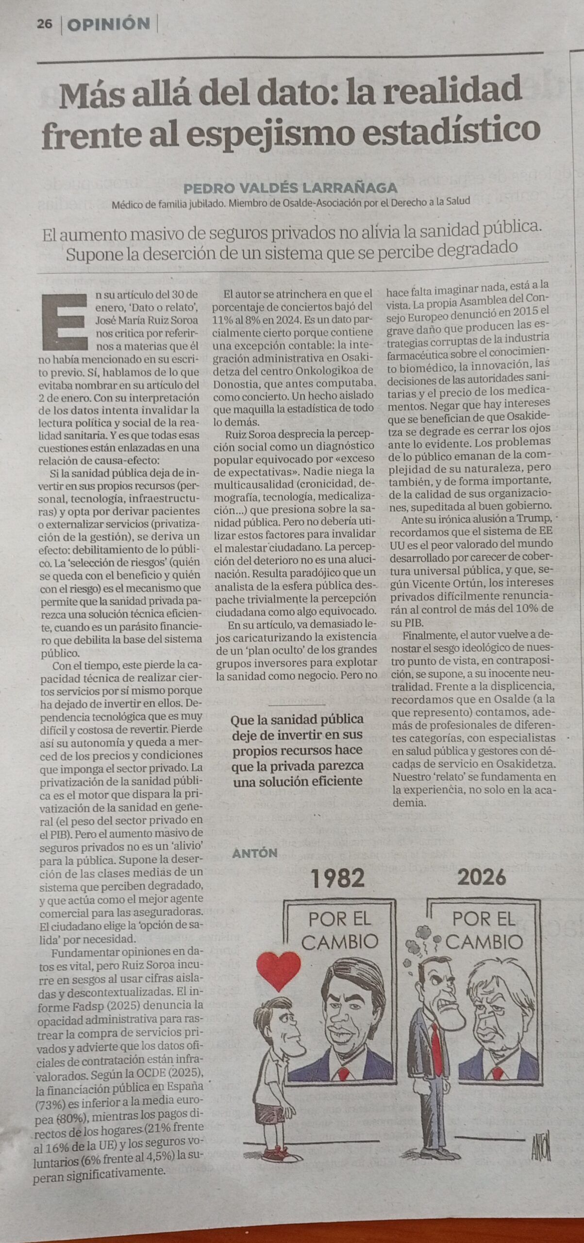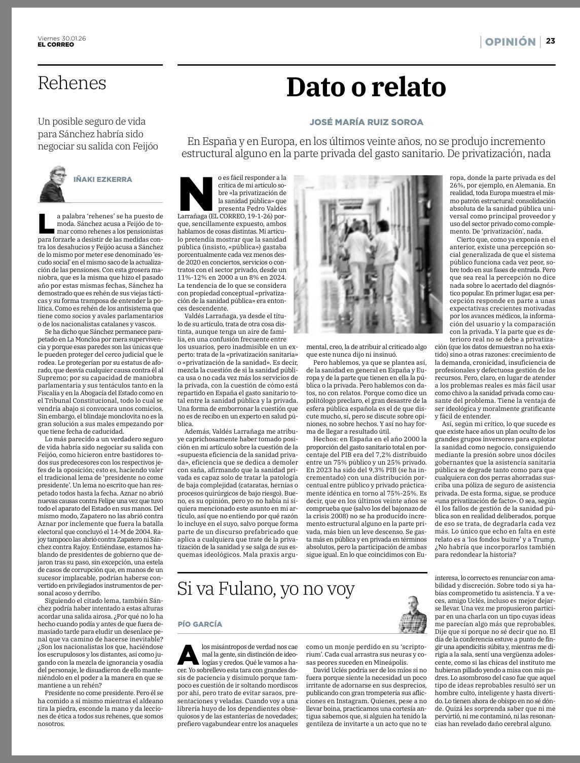 Réplica de Pedro Valdés (OSALDE) en El Correo al artículo de Jose María Ruiz Soroa «Dato o relato» (a su vez respuesta al artículo de Pedro Valdés «Privatización sanitaria: no es solo cuestión de porcentaje»)