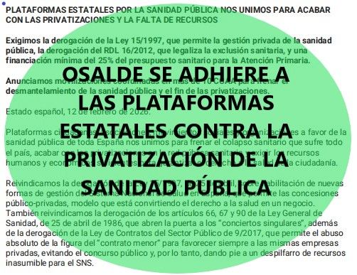 OSALDE se adhiere a estas plataformas y sus acciones contra los procesos de privatización que están desmantelando la Sanidad Pública